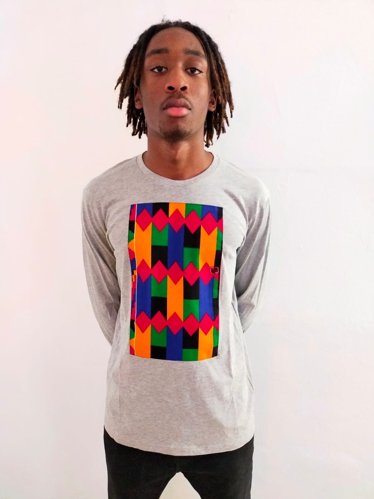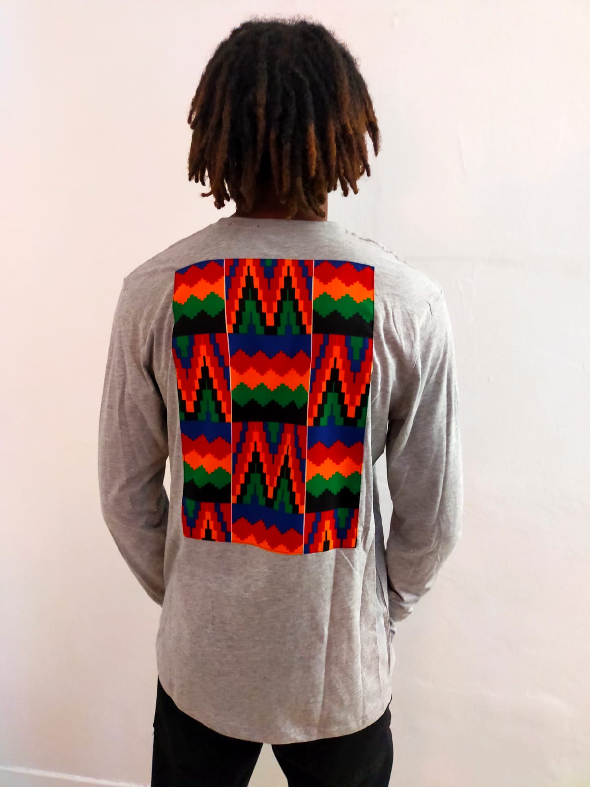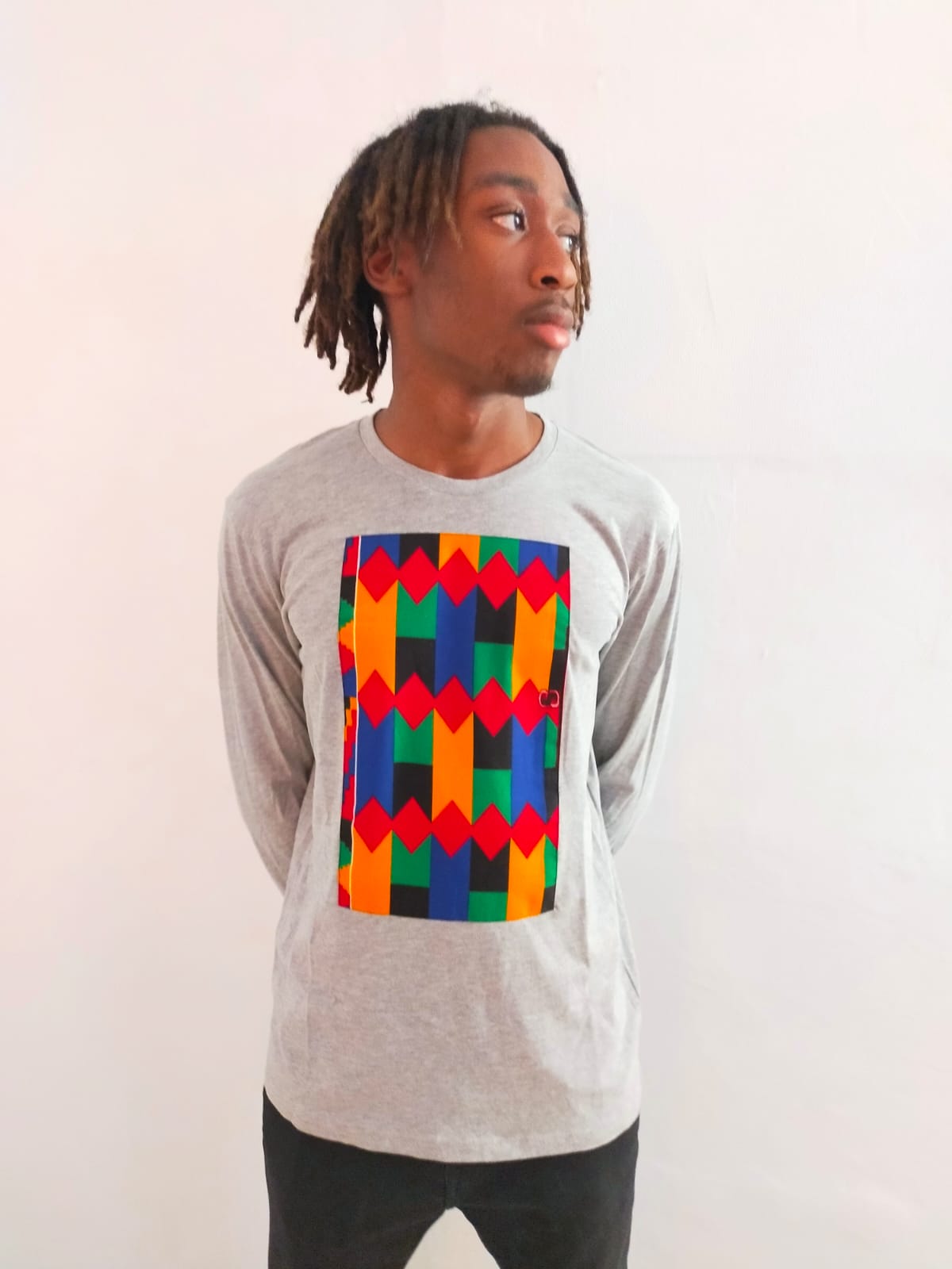 Tee-Shirt, Coton Bio, Hommes, Femmes, Manches Longues, Gris Imprimer Africain. Lavable, Lavage en Machine.